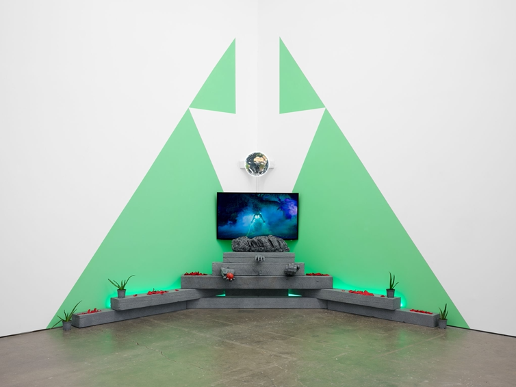 Patricia Domínguez, Madre Drone, 2019-2020, 4k video and 3d animation on holographic projector, audio, loop, 20:51 min, sculptures and stone, dimensions variable